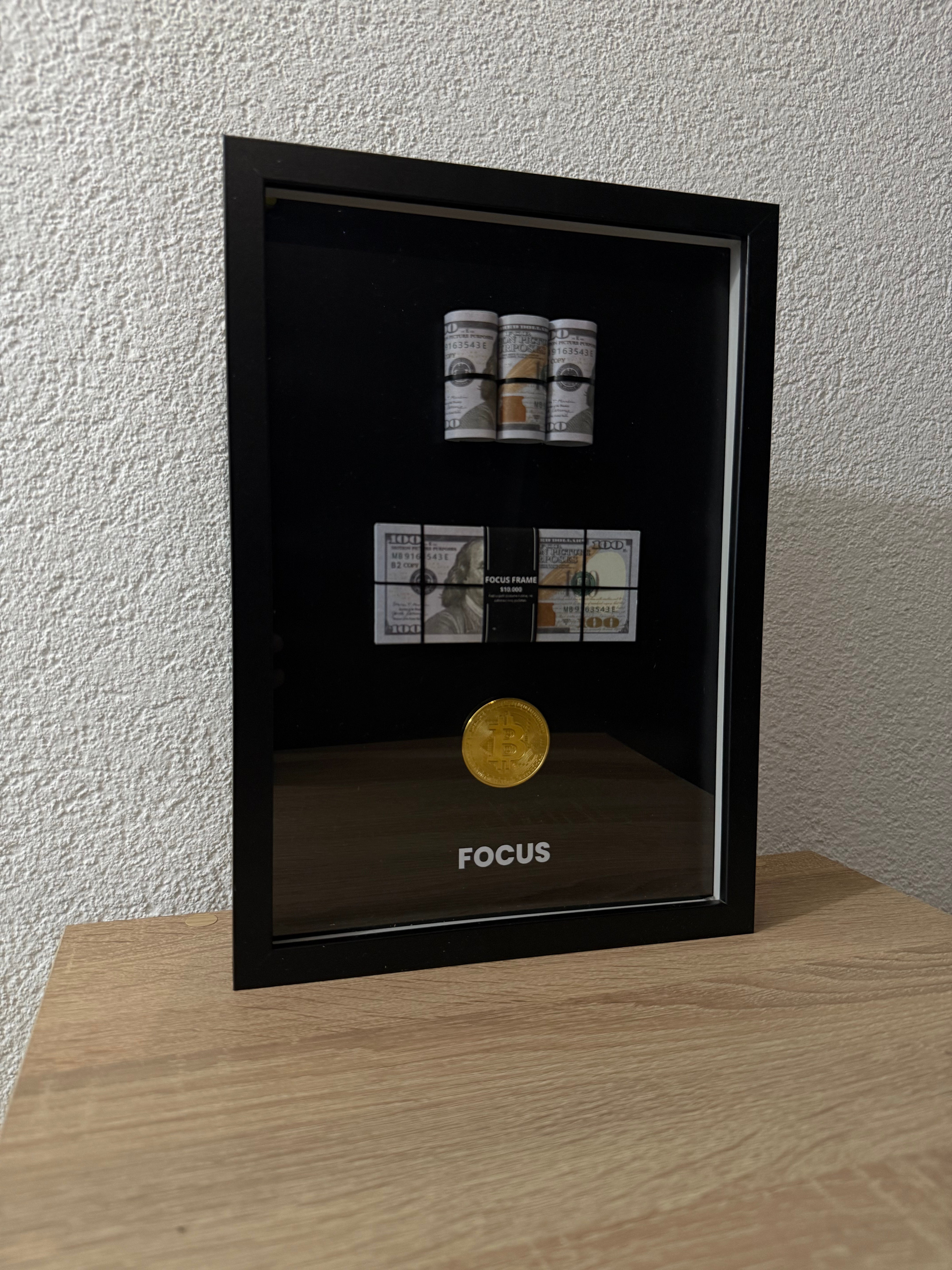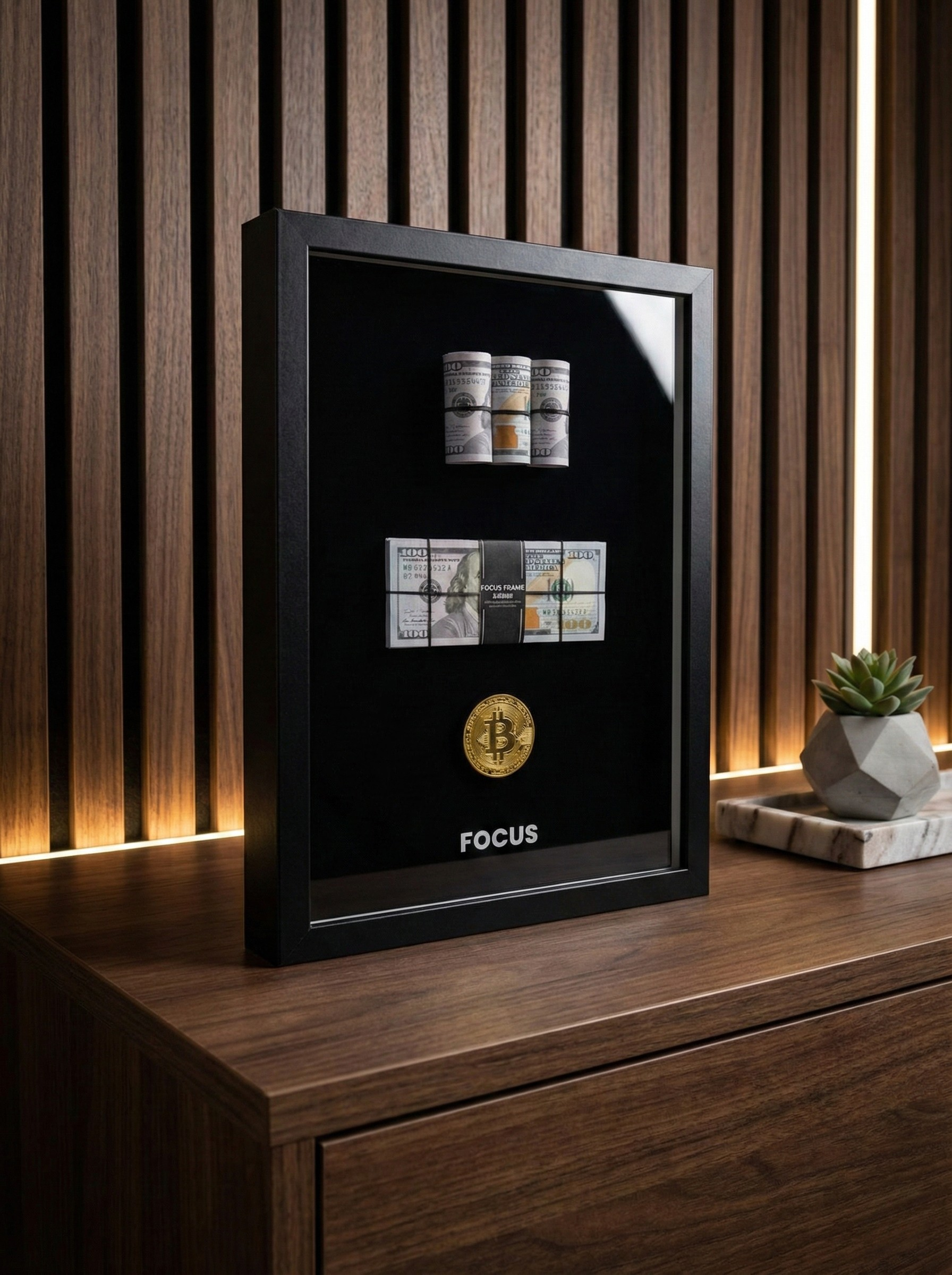 FOCCUS FRAME kolekcija stvorena je za one koji razumeju da uspeh nije slučajnost već rezultat fokusa, discipline i istrajnosti. Svaki ram ručno je izrađen, s preciznošću i posvećenošću koja odražava vrednosti koje i sam simbolizuje. U njegovom okviru nalaze se pažljivo odabrani elementi dolar, bitkoin, zlatni detalji koji su simboli ambicije, stabilnosti i vizije budućnosti.