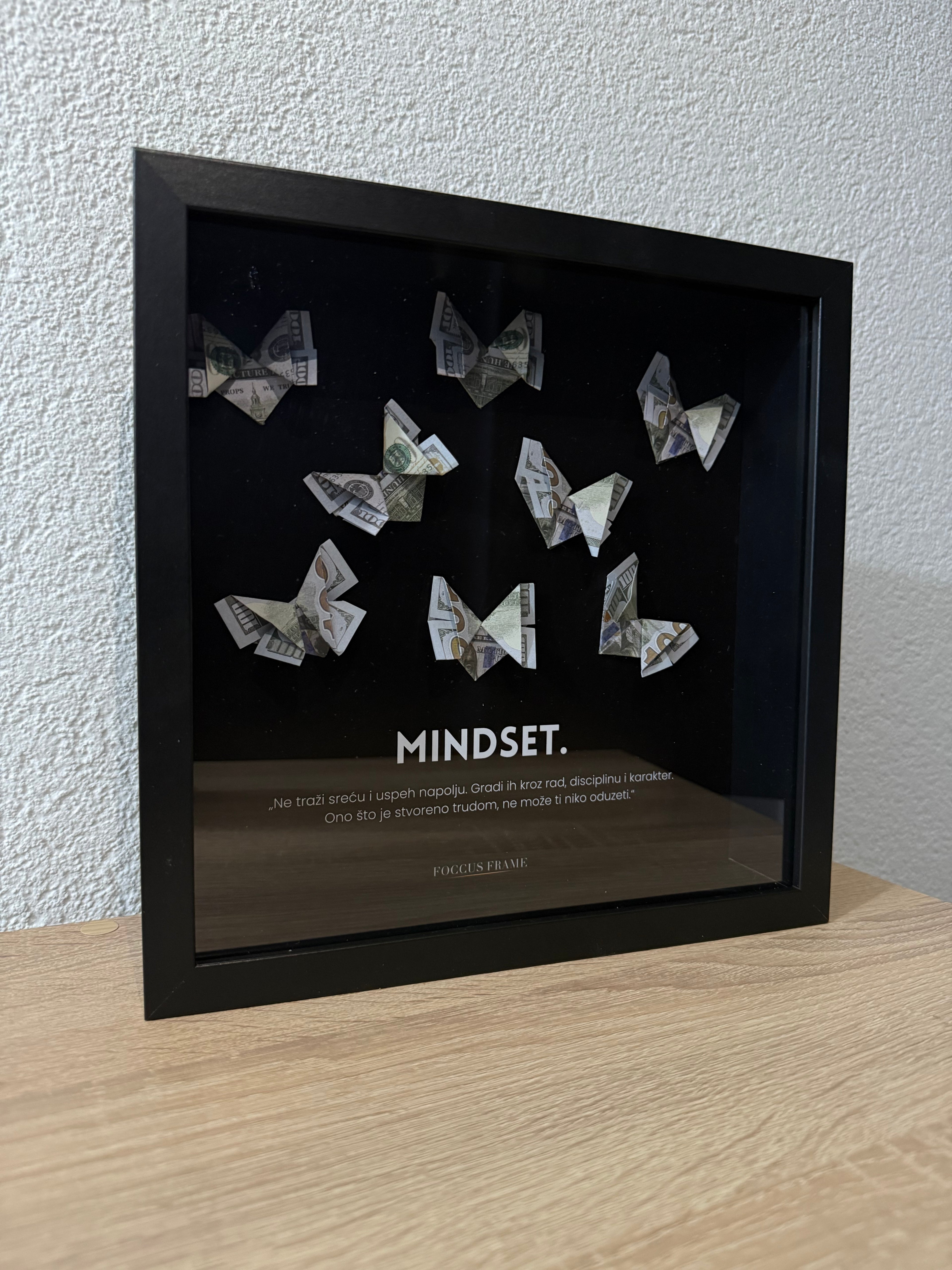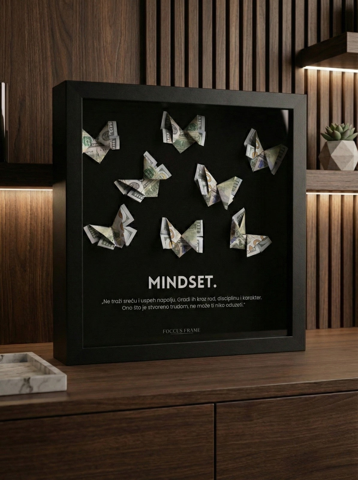 Unutar rama nalaze se leptiri od novca kao simbol rezultata koje donosi pravi mindset rast, stabilnost i finansijski napredak.